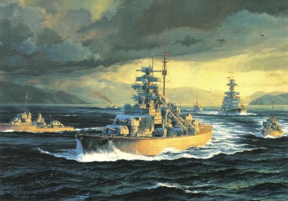 The German Naval High Command (OKM) conceived of a commerce raiding operation to support the expanding U-boat operations--Operation Rheinübung (Rhine Exercize). With the failure of the Luftwaffe in the Battle of Britain (July-September 1940), Hitler's only channce of knocking Britain out of the War before Barbarossa and eventual American entry into the War was the Kreigesmarine. Hitler had misgivings about the operation when informed, but the potential payoff was massive. The assisnment was given to Admiral Lütjens. Hitler along with Field Marshal Wilhelm Keitel, Supreme Command of the Armed Forces, and a substantial entourage, inspected Bismarck and Tirpitz at Gotenhafen/Gdynia (May 5). Gdynia was a Baltic port in occupied Poland which had been annexed to the Reich. (It would appear again more importantly in history as the future birthplace of Solidarity). Hitler and his entourage toured both ships. He than met with Admiral Lütjens to discuss Rheinübung. Two weeks later Captain Ernest Lindemann sailed Bismarck from Gdynia with the heavy cruiser Prinz Eugen (May 18). OKM aspart of Rheinübung positioned two supply ships and five tankers in the Atlantic to support the operation. Scouting ships were dispatched to locate targets. This was not a quixotic effort. The U-boats were already taking a heavy toll on British shipping. Only the convoy system was keeping Britain in the War with the flow of American and Commonwealth supplies and material. Bismarck would have disrupted any convoy it encountered, destroying many ships and forcing the convoy master to order the merchant vessels to disperse. Convoy escorts would have been inefectual against the heavily armored German ship. Bismarck left her anchorage at Grimstadt Fjord and headed into the North Sea (May 21). She was accompanied by Prinz Eugen, destroyers Z10, Z16, Z23, and a mind-sweeper.