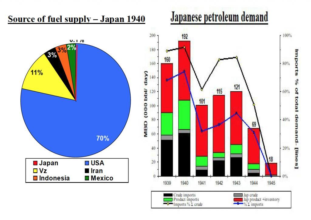 No only was Japan almost totally dependant on imported oil, but Japanese oil companies had been shut out of the major oil-producing areas. Japan imported about 90 percent of its oil. To make matters worse for Japan, the United States was the major world producer of oil and Japan's principal supplier. And America was beginning to back demands that Japan withdraw from China with increasingly serious economic sanctions. And America with its Pacific fleet was the country Japan would have to fight if it was to expand its aggression beyond China and move to seize an empire in the resource-rich South Pacific--the Southern Resource Zone. Japan imported 1.0 million barrels from Soviet Sakhalin. There were other options, including British Borneo, the Dutch East Indies (DEI), Mexico, and Venezuela. And Japam did import some oil from the DEI amd Mexico. In the DEI two compnies were important, Shell and the Standard-Vacuum Oil Company (Vz) Shell was a British-Dutch joint venture. Vz was a subsidiary of Standard Oil (New Jersey) and Socony-Vacuum. The DEI possessed the largest reserves in East Asia, but British fields in Borneo were akso important. Japan's major source of oil was the United States. The problem for the Japanese is that the British and Dutch generally followed American initiatives as did Mexico and Venezuela. This left Japan vulnerable to economic and political pressure and America moved beyond polite diplomatic messages to applying pressure in the form of economic sanctions. In addition, the Royal Navy controlled access to Middle Eastern oil and the U.S. Navy controlled acces to Latin America oil, not only thiygh diplomatic pressure, but through control of the Panama Canal. Before the invasion of China, Japan had been purchasing 80 percent of its oil in the United States (1937). The United States through its moral persuasion policy had suceeded in convincing American ship owners to reduce shipments to Japan without any formal action. Thus on the brink of war the Japanese were only obtaining 60 percent of their oil from America (1941). The Americn sanctions were painful, but the United States continued selling oil, if reduced amounts. America knew that the game chnger would be an oil embargo. Japan would consider it an act of War. Jaoan would have to either acceed to Americn demands or go to war.