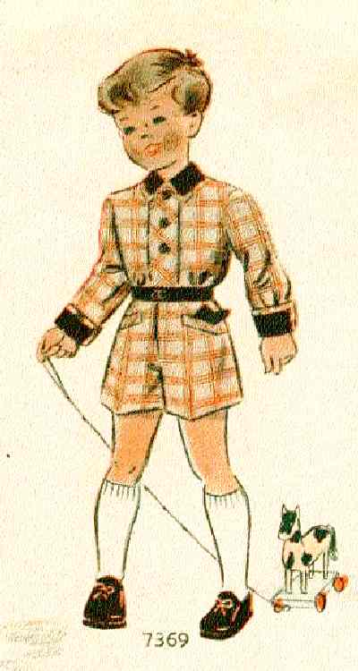Vrouw en Huis offered pattern 7369 for a younger boy's suit. It was made in fine wool with a destinctive pattern. There is satin colar, satin sash (belt) and sleeve cuff trim in a contrasting color. The short pants have two slant pockets. While it looks like velvet trim, the pattern specifies satin. The outfit was made for 6-7 year old boy. The illustration shows a boy playing with a toy, suggesting that the outfit was not just for dress occasions. The boy wears his outfit with white kneesocks and lace-up shoes.