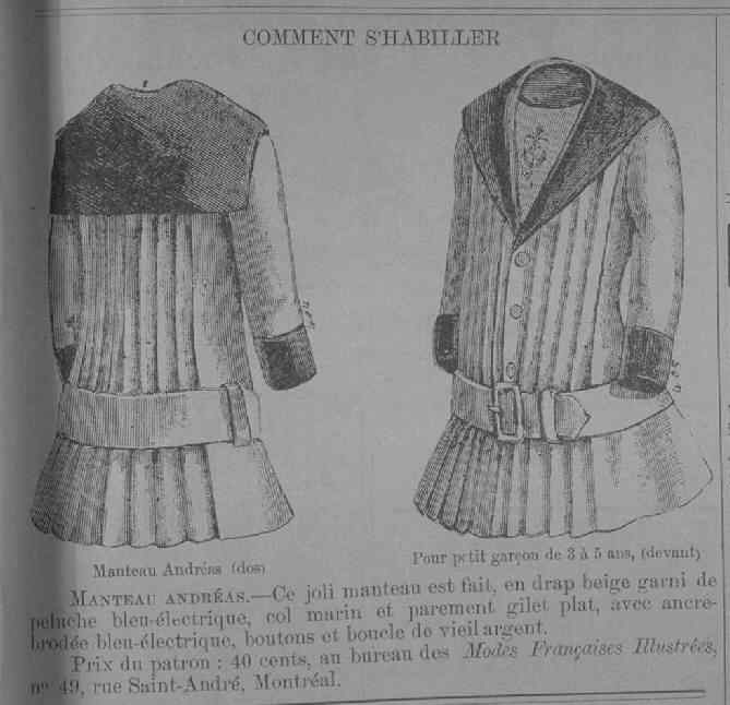 We note a boy's sailor dress for a 3-5 year old boy offered in Le Monde during 1885. Sailor suits were very popular at the time. Boy dresses were done in many different styles, one of which was sailor styling. TThe garment here is a frint buttoning dress, heavily pleated. Notice the dickey with an embroidered anchor. he ad was headed "Comment S'habiller". The ad provided both a front and back view. It was referred to as a "Manteaus Andréas (dos)" Manteau is commonly used to mean coat, but here seems to be used to mean dress. I'm not sured why it was called a "Mareau Andréas" or what the "dos referred to. The rear view was labeled "Pour petit garçon de 2 à 5 ans (devant)", meamin "For little boy 2-5 years (back)". The ad copy read, "Manteau Andréas. -- Ce joli manteau est fait, en drap beige garni brodée bleu-électrique, boutons et boucle de vieil argent. Prix du patron: 40 cents, au bureau des Modes Françaises Illustrées, 49 rue Saint-André, Montréal." Ths would transkate as, "This pretty coat is made, out of furnished beige cloth decorated with electric-blue embroidery, buttons and buckles of old silver. Price of the pattern: 40 hundreds, at the office of the French Modes Illustrated, 49 street Saint-Andrew, Montreal.
