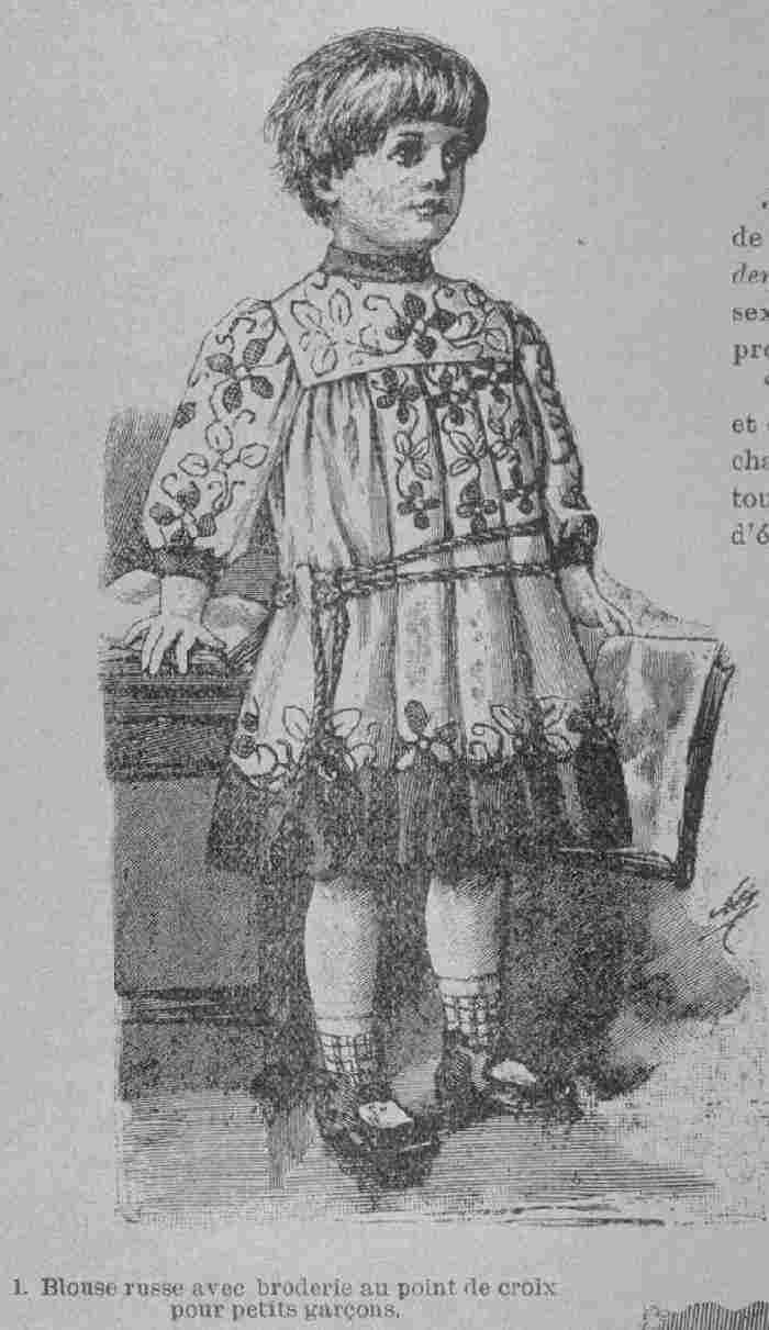 Younger boys still commonly wore dresses in 1900. This convention was declining, but still widespread. We have a Canadian advertisement for a little boy dress with crosspoint embroiderie in 1900. I am not positive anout the date. Rounded numbers are sometimes used as estimates. The style does look correct for the period. We are not entirely sure about the source. It is a Quebec ad and written in French. A HBC reader suggests that it is a newspaper advertisement. This is possible, but we note it appeared on page 588. I'm not sure how Canadian newspapers were paginated, but it seems to us that it more likely was in some kind of magazine or journal. Perhaps it was a fashion magazine of some type. The illustration is captioned, "1. Blouse russe avec broderie au point de croix pour petits garçons". That means, "Russian blouse for little boy embroidered with needle point. Underneath the illustration there is a "Description de la mode". Unfortunately the ad copy is cropped, so we do ot know what it said. It does not look, however, like a newspaper advertisement.