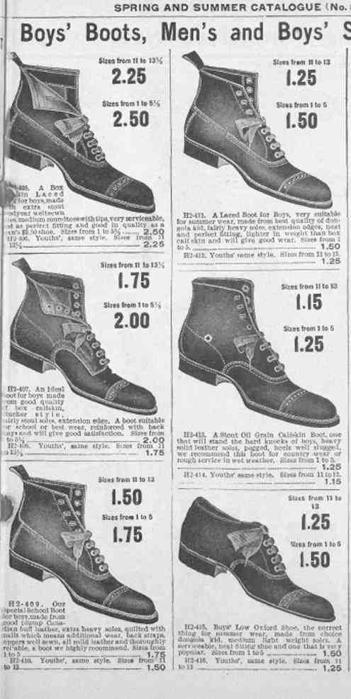 The Eatons ad copy read, "H2-405. A Box calf skin, Laced boot for boys, made in extra stout bodywear, weltsewn, medium round toes with tips, very serviceable, as perfect fitting and good in quality as a man’s $3.50 shoe. Sizes from 1 to 5 ½ $2.50. H2-406. Youths’, same style. Sizes from 11 to 13 ½ $2.25."