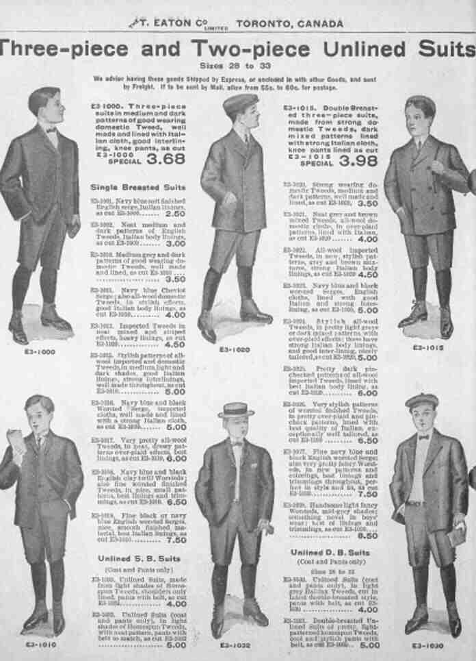 Eaton's had several pages on suits, showing that boys still very commonly wore suits. One page shows the variety of styles of knee pants suits that were fashionable. The styles seem very similar to the United States. Norfolk styling seems especially popular. Canadian boys up to the age of at least 14 years wore knee pants suits. These styles show both single and double-breasted models. These are dress-up clothes for boys from about 10 to 16. The sizes are chest circumferences. In the 1907 catalog there is a variety of knee pants suits in chest sizes 29-33 (which is roughly up to size 16 or perhaps even 17). No long trousers are shown for boys with chest sizes smaller than 34 (which is about 18 years old). These are called "Young Men's and