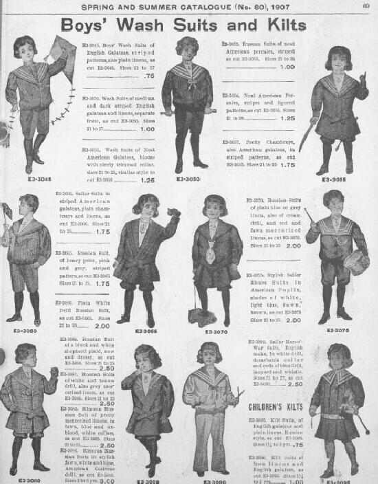 Younger boys commonly wore a variety of skirted garment in the 19th century. This convention began to change in the 1890s and after the beginning of the 20th century century began to go out of style. This ocurred both in Europe and North America. The Eaton's catalog is one way we can track these conventions. We no longer see boy dresses in the 1907 catalog. We also do not see kilt suits, although probably reflecting how popular kilt suits once were, Eatons does continue to use the term. The one exception to this shift away from skirted garments is tunic suits which were very popular and prominantly featured in the 1907 Eaton's catalog. Eatons does not call them tunic suits, but rather kilt suits and Russian suits. They are, however, what HBC refers to as tunic suits. We note American catalogs also had various terms for tunic suits. In addition to tunic suits, we also notice a skirted middy blouse outfit which Eatons also calls a kilt suit.