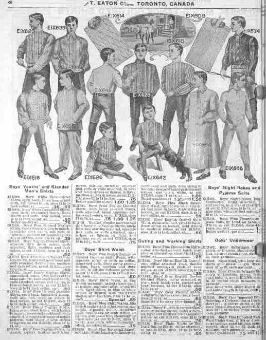 The Eaton's ad copy read, "Boys’ fine Imported Natural Wool Underwear, shirts or drawers, beige facings, pearl buttons, summer weight. Sizes 22 to 32 chest measure, each garment. [price obscured] Better quality at 75 cents and $1.00." We are not sure why Canada in 1907 was imported boys' underwear. Perhaps Canadaxwas still developing its clothing industry.