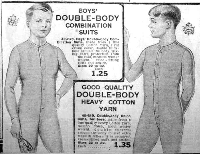 4C-620--Boys’ Double-Body Combination Suits: The Eatons ad copy read, "Boys’ Double-body combination Suits, made from a fine quality Cotton Yarn, light cream color, double thickness around the body, giving extra protection from the cold, medium winter weight, close-fitting cuffs and ankles. Sizes 22 to 32 [chest measurement]. [Sizes to fit boys from about 10 to 14, or perhaps even 15 or 16] Each, $1.25."