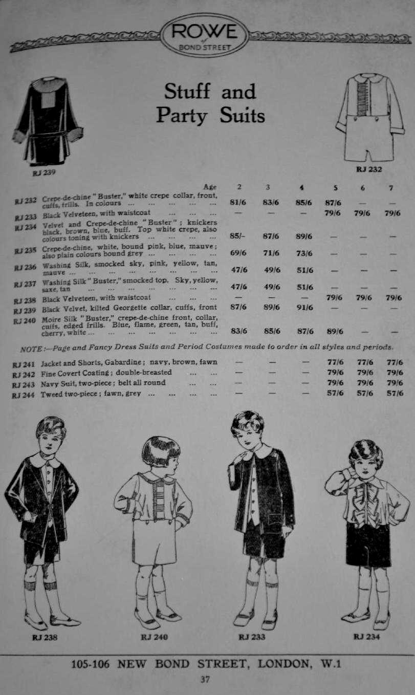 English boys up to about 8 years of age wore a wide range of fancy juvenile suits. They might be called party suits, of course meaning outfts for parties and other spcial occassions. Unlike today, children used to dress up for parties. Age 8 years was an important age for suit styling. At about this age boys from affluent families were often sent the boys off to boarding schools. Thus high-end stores began oferring more mature looking suits for boys at about this age. Thus you can see that these fancy suits were only offered up to size 7 years and most in even younger sizes. Give the very high prices that Rowe charged, virtually all of the children for whom the outfits were purchased would be sent to private schools which at the time usually meant boarding schools. Of course when we say private schools, this meant preparatory schools and than public schools.