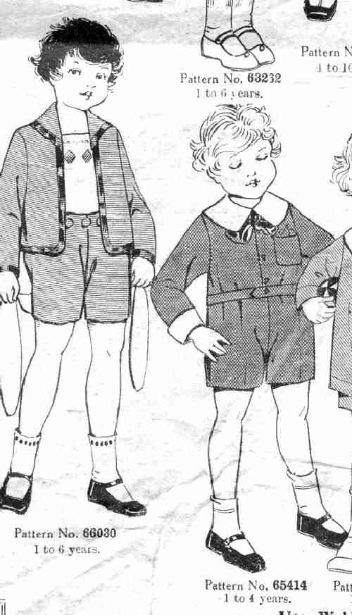 On left is a boy's cloth suit pattern number 66030 (figure 1). It is called a suit because the jacket and shorts match. The pattern is for a boy from 1-6 years of age. It is a colored suit with a jacket matching the shorts which Weldon's calls knickers. The jacket is trimmed at the edges and the shorts appear to be button on style. The jacket has a breast pocket. The boy has a collarsless vest or shirt worn under the jacket. The pattern is for all three garments. It is shown worn with white socks and the old style of strap shoe with the strap at the top of the shoe. Despite the sreap shoes, the outfit looks rather like a stylish play suit.