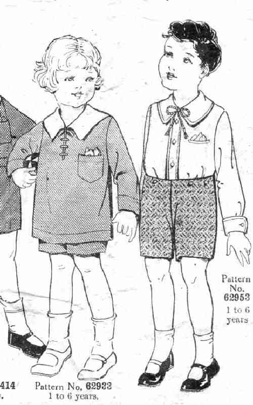 The pattern on the right is a shirt and shorts set, pattern 62953. Weldon's refers to it as shirt and knickers. The shirt has a large attched Peter Pan rounded collar with edging. It is worn with a little string tie. The white shirt is worn with heavy colored shorts in the button-on style. It is shown worn with white socks and black strap shoes.