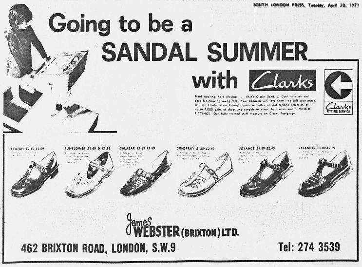 The ad appeared in the 'South London Press', April 20, 1971. It was placed by a retailer--James Webster (Brixton). The heading here read "Going to be a sandal summer with Clarks".