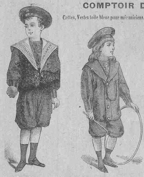 Boys commonly wore sailor hats and suits. The Nouvelles Galeries department store offered a wide range of sailor suits for boys, often in sizes up to about 12 years.