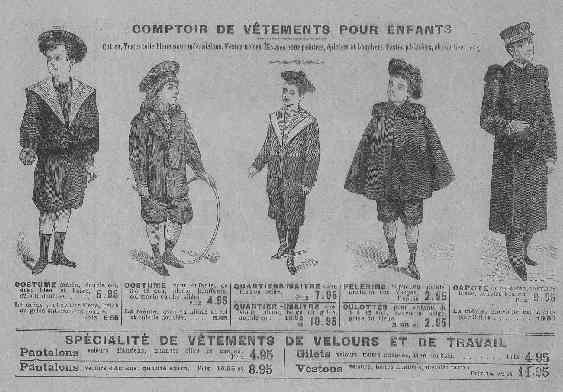French mail order catalogs and clothing advertisements offer a very useful time line on changing fashion trends. Boys commonly wore sailor hats and suits. Department stores offered a wide range of sailor suits for boys, often in sizes up to about 12 years. Blouced knicker suits called "culottes" were the most common. Sailor caps were also very popular. An sailor suit syle was also available for older boys attending colleges (secondary schools). These look like military school uniforms.