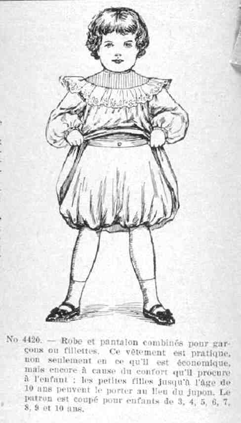 This French newspaper ad from 1903. We do not know the title of the newspaper. The ad offered a child's dress for a boy or girl. It had patalon combinés. I'm notsure hoe to translate that. Pantalon would translate as bloomers or drawers. I'm not sure what the "combinés" means. It could mean a type of bloomers or just mean that they matched the dress. The dress was for a child ages 3 to 10 years old. Only younger boys would have worn it, although the ad curiously stresses that it is appropriate for younger girls. The age of breeching varied from familt to family. The ad copy read, "No. 442 -- Robe et pantalon combinées pour garçon ou fillettes. Ce vêtement est pratique, non seulement en ce qu'll est écounomique mais encore å cause du confort qu'il procure å l'enfant; les petites filles jusqu'å l'áge de 10 ans peuvent le porter au lieu du jupon. Le patron est coupé pour enfants de 3, 4. 5, 6, 7, 8. 9. 10 ans."