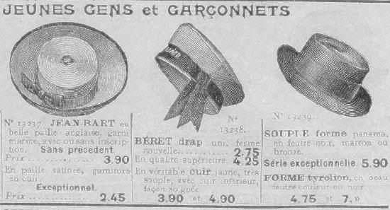 The ad copy reads, "Jean Bart en belle paile anglaise garni marine, avec ou sans inscription. Sans précédent. Prix ... Fr 3.90. En paille satinée, garnitute en cuir. Exceptionnel. Prix ... Fr 2.45." HBC is not sure just who Jean Bart was and why this cap is named after him. Presumably he is a French sailor.