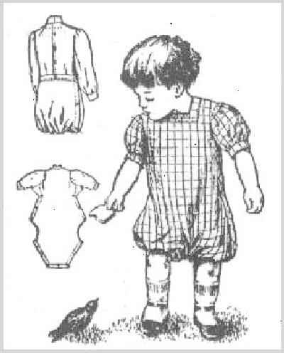 A HBC reader has provided us an illustration from a French publication. We are sure of the actual source. This is the earliest romper we have noted in French publications. We do not know who introduced it and for that reason can not at this time definitively substantiate the date. Wedo not have any of the ad copy and can not even be sure that the term "baboteuse" was used at this time. Note the romper back view is long sleeved while open matches front view. It isa back buttoning outfit without the bow that appeared on later models. There is a suare cut open collar.