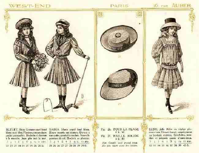 We note a Paris store which appeared to be called West End. This is not a store we know anything about. Wedo know that it was an extremely large department store located at Rue Caumartin, Rue Auber, and Haussman. There can't have been many stores that were larger. Perhaps our French readers will know about it. The use of an English names presumably indicates a fashionable high-end store. We have an ad from the store offering girls sailor dresses. The two sailor dresses have traditional V-front styling and almost certainly a back flap. The bodice of the dress would have been virually identical to a boy's sailor suit. The sailor hats are also quite similar to boys' sailor hats. These sailor dresses look like summer dresses which is probably why the third dress was put with them on the same page.
