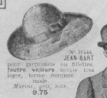 The ad copy read, "No. 31444. Jean Bart pour garçonnets ou fillettes; feutre velours souple tres léger, forme dernière mode. Marine, gris, noir. ... Fr 9.75." This would translate as, "'Jean Bart' for both little boys or young girls, very light flexible/soft velvet/felt, latest fashionable style. Navy, gray, black ... Fr 9.75."