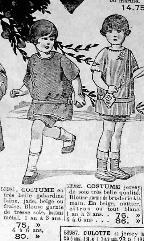 French mail order catalogs and clothing advertisements offer a very useful time line on changing fashion trends. We note a wide range of suits for juvenile boys and older boys offered by the Louvre department store in Paris. We also notice different detachable colors. Kneepants were still being worn. Advertisments showed a variety of new smock styles. There were many distinctive styles for girls. Some smocks were worn by boys and girls. Shirts were still made with detachable collars. The Louvre catalog provides a great deal of useful information. "Notice that a suit for boys to age 16 years has short trousers and only the sailor suit has long pants but in each case it is offered with short pants too. Also there is an underwaist sold for boys through age 10. Also blouses which almost resemble tunics were sold through age 13 (page 80). Very different than in United States. Notice all the sailor suits called Marin. One is a knit version that resembles a modified tunic suit and goes from ages 2 to 14 (page 82). Long stockings for sports are shown as well as heavy knit knee length under drawers and a knit button front shirt (psage 83). The same page has a large assortment of ties. More than would be shown on Wards or Sears for the same year. Also notice that on page 74 night shirts for boys Chemise de nuit and combination (one piece pjs) are offered for boys (page 74). There is something called combination for day for up to 12 year olds (page 86). This looks something like a one piece play suit in the U.S. catalogs. Also on page 86 are many shirts to age 16 from 2 or 3 to age 16 which did not happen in the U.S. (page 86) The styles were different for such a