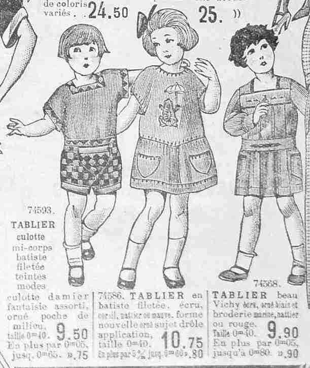 The Lovre department store offered differnt styles of childrens smocks in 1924. The store used the term "tablier". One style for boys was a "tablier cullote" meaning smock shorts. The ad copy does not include any clues as to gender suitability, but the models used in the illustration suggest one was for girls and the other for boys. Sizes varied up to 0.6-0,8 meters (60-80 cm) but the largest size was for the boy's' smock. Note the children are pictured with white smocks and strap shoes.