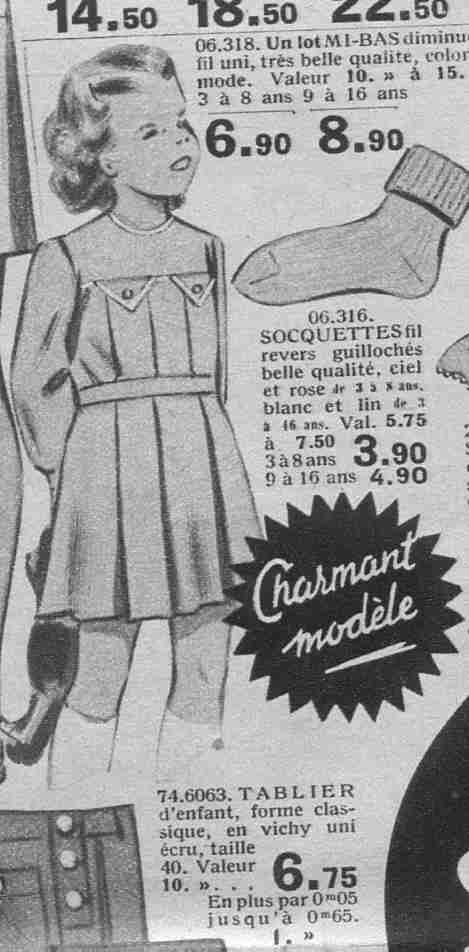 Le Louvre offered a classically style school smock for boys and girls in 1936. The ad copy reads, "74.6063. Tablier d'enfant, forme classique, en vichy uni écru, taille 40. Valeur Fr 10 >> Fr 6.75. En plus par 0m05 jusqu'a 0m65 >> Fr1. This would translate as, "Chidren's smock, traditional styling, in unbleached plain ginham, size 40. Value Fr 10 >> Fr 6.75. Larger sizes in increments of 0m05 until 0m65 >> cost Fr 1 extra."
