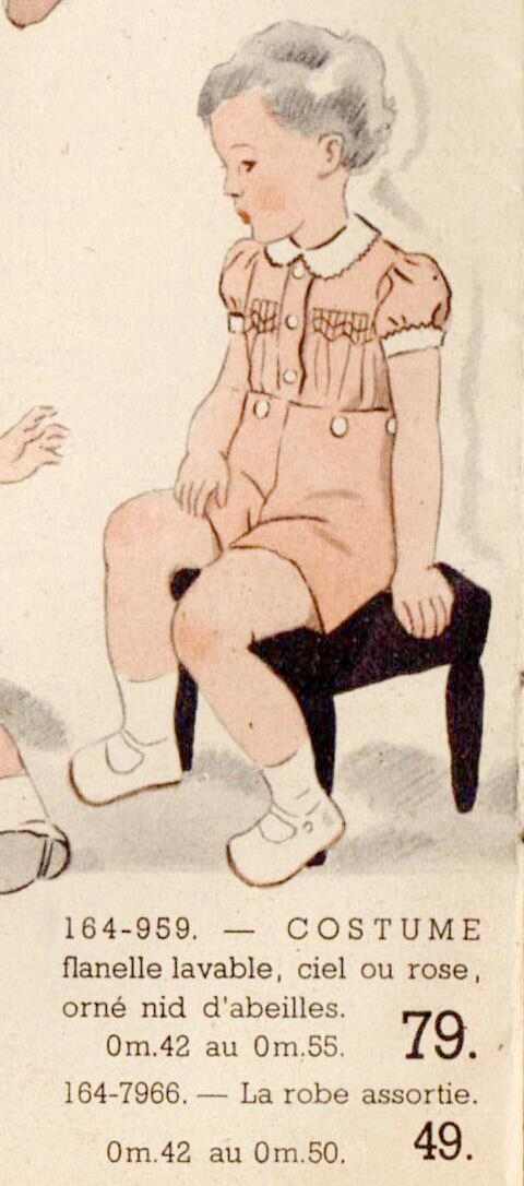 This outfit was a button-on smocked blouse and matching short pants. The blouse had a Peter Pan white collar, baloon sleeves and front smocking. There was also a coorinated dress, but it was not illustrated. The Galeries Lafayette ad copy read, "164-959 -- Costume flanelle lavable, ciel ou rose, orné nid d'abeilles. 0m.42 au 0m.55. 79Fr." This translates as, "SUIT washable flannel , blue-sky or pink, smocked . 42-55 cmm 79 francs." The ad copy for the coordinated dress read, "164-7966. -- La robe assortie. 0m.42 au 0m.50. 49 Fr." This translates as, "The matched dress. 42-50 cm. 49 francs."