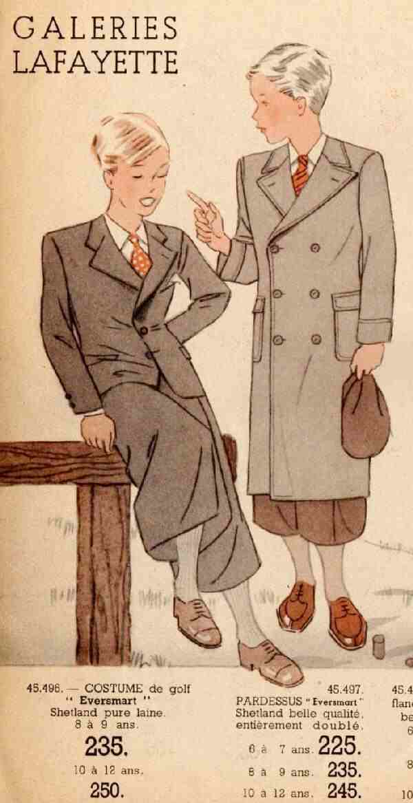 Galeries Lafayette offered this pardessus in its Spring children caralog. I'm not sure what a pardessus was and how it differed from a manteau. Perhaps it referred to the length. The one here was done with double-breasted styling for boys 8-12 years of age. Notice the term "Eversmart". French catalogs liked to use English terms to give an item a stylish image. The Galeries Lafayette ad copy read, "45.497. Pardessus 'Eversmart' Shetland belle qualité, entièrement doublé, 6 à 7 ans 225 Fr, 8 à 9 ans 130 Fr, 10 à 12 145 Fr." This translates as, "??? "Eversmart" good quality Shetland [wool] souble breasted. 6 to 7 years 225 Francs, 8 to 9 years 130 Francs, 10 to 12 145 Francs."