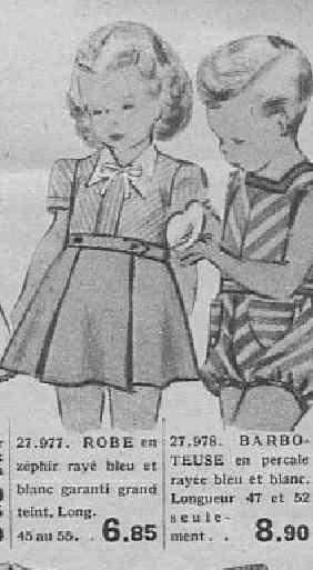 A romper or "barboteuse" is offered for a younger boy. It is a stripped percale romper with a square collar. The ad copy reads, "Barboteuse en percale rayée bleu et blanc, Longueur 47 et 52 seulement Fr 8.90." That means triped percale rompers blue and white, Length 47 and 52 only Fr 8.90. That seems rather a rarrow range of sizes, but would probably fit many 3-5 years olds. The sleevless styling looks rather like a casual or play suit. Notice the two small pockets and waist band.