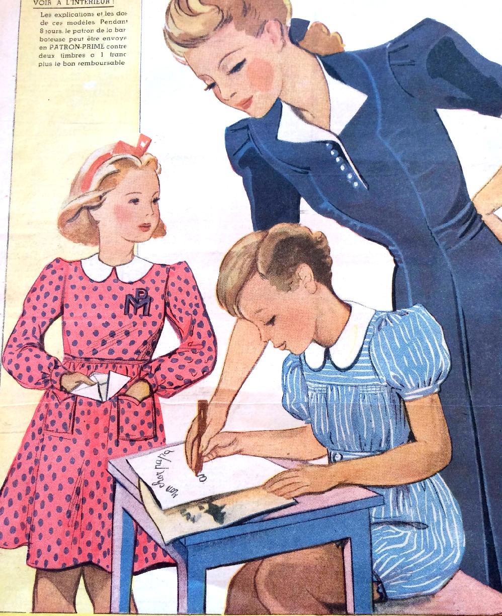 Rompers called barboteuses by the French were a popular garmdent for younger boys. They were only worn by boys. Girls wore dresses. Here we have the cover from waht we take take to be be a pattern envelope dated 1939-40. We are not sure about the name of the company. We think it may be MP. Nor are we sure about what the pattern was for, the dress or romper suit -- perhaps both. Note that thec top of trhe dress and the romper suit are identical. The caption reads,"Voir a l'interieur Les explicationes et les dosde ces modéles, Pendant 8 jours. Le patron de la barboteuse peur étre envoye en PATRON-PRIME contre deux timbres a 1 franc plus le bon remboursable." That means something like,"See inside the explanations and the backs of these models, During 8 days. The pattern of the romper can be sent as PATRON-BONUS against two stamps at 1 franc plus the refundable voucher." We do not fully understand that. Perhaps a French reader will be able to explsain. But the illustration clearly shows a boy wearing a romper suit with puffed sleeves and Perter Pan collar, and the illustration suggests a school-age boy. This is a litle surprising because except for pre-school, French boys did not generally wear rompers to school. This is claerly shown in the photographic record. What was common at the time was smocks. We do see some school-age boys wearing rompers, but mostly at home. Notice that the very fashionably dressed mother is helping the boy with his writing. We suspect that this was meant to indicate that she was preparing him to begin school at home, meaning he was about 5-6 years old. French boys as in America began school as age 6 years, but some boys turned 6 after the school year began.