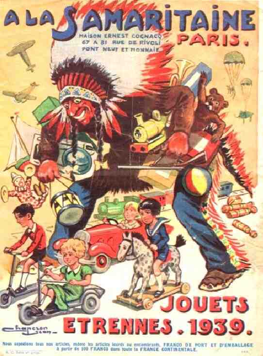 The big Fremch department stores also sold toys. Here is an add from La Samaritaine, an important Paris Department store. We note a Samaritaine adverisement dates July 1939. I'm not sure if it is a advertisement or a catalog cover. La Samaritaine is either the earliest or at least one of the earliest department stores ever built. Situated in the historic center of Paris, between the Louvre and Châtelet and opposite the Ile de la Cité, the famous department store got its name from an old water pump near the Pont Neuf.