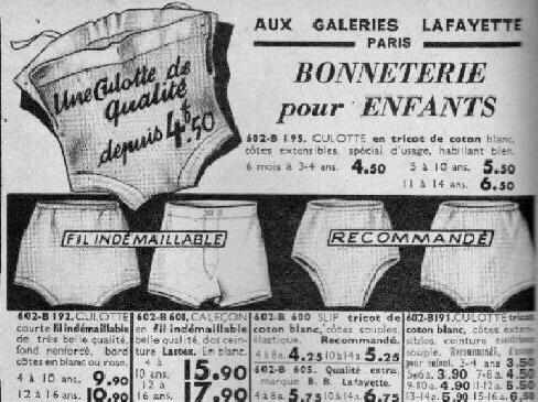 A French reader tells us about some underwear for younger children. He forwarded us a Gallerias Lafayette advertisement for bonneterie. I think that means underwear. He tells us, "The Gallerias Lafayette 1939 underwear advertisement here has styles that were commonly worn in both urban and rural areas. Older styles tended to persist in urban areas after they had disappeared among city children. The garment in second position was rather for country boys. The garment at the top and