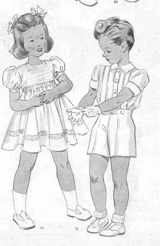 Modes et travaux in its June 1941 issue offered pattern for the fancy button-on outfit seen here. The boy's pattern was for a 4-year old. Note the button-on styling, and the puffed sleaved and ruffled collar blouse. The girl's pattern was for a 5-year old. Notice the boy, but not the girl, wears white gloves.