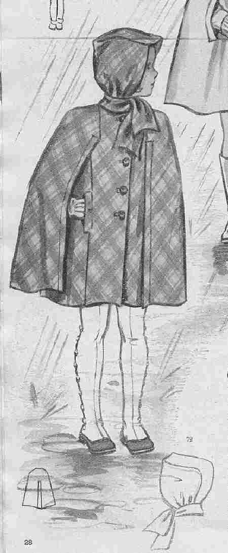Modes et travaux was perhaps the most important French sewing magazine in the 1940s. During the German occupation after 1941, clothing became increasingly difficult to obtain. Thus sewing your own or your family's clothing became increasingly important. The title reads, "Filles ou Garçons aiment le Capuchon". That would translate as, "Boys and girls like capes", stressing the capes that appeared on the same page as the little boys' outfits. The author then goes on to describe six different garments or outfits. The cloak shown here is one of the garments. The inference is that these capes on rainy days could be worn with the other outfits shown.