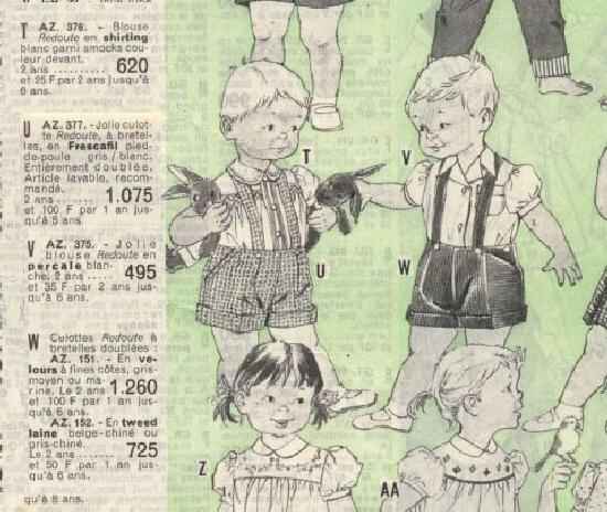 These models were very popular and commonly worn from the end of Workld War II through the 1950s. Practicly all the French boys have worn these models and similar romper during the 1940s and 50s." HBC notes that one of the blouses here is quite plain. This suggests that the fancy blouses were beginning to go out of style. The models in the 1960s indeed became less fancy and were increasingly worn by younger boys. Another reader writes, "HBC is perfectly right. These and other French styles were also sold widely sold Belgium. Many Belgians speak French. They are called Waloons. There has been a close assoiciationn between France and Belgium since the country was established in 1830."