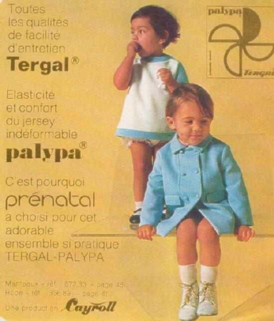 A HBC reader has provided this image from a 1970 Prénatal catalog. Prénatal is a French chain of stories specializing in baby care products and clothes for younger children. A French reader reports that Prénatal is a nationally known chain and very popular because of the quality of their mrchandize. The text on the ad refers to Prénatal in general and not just the manteau baby in generl. It reads, "Toutes les qualites de facilité d'entretien Tergal®. Elasticité et confort du jersey indéformable Palypa®. C'est pourquoi Prénatal a choisi pour cet adorable ensemble si pratique Tergal-Palypa." This translates as something like, "All qualities of the easy maintainability of Tergal®. Elasticity and comfort of the undeformable jersey Palypa®. This is why Prénatal has chosen Tergal-Palypa for this adorable and pratical ensemble "