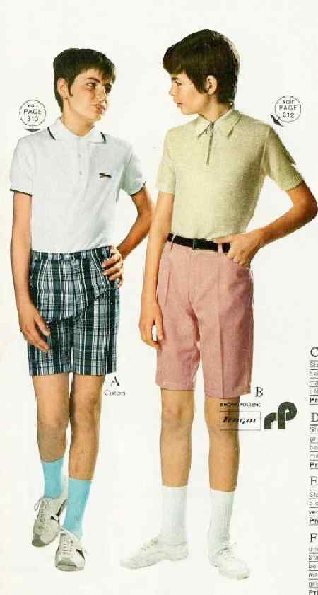La Redoute in 1971 offered two styles of casual Bermuda-style shorts in slightly different lengths, styles, colors/patterns, and material (cotton and Tergal). The jean style had belt loops and the madras style did not require a belt. These casual shorts were longer than some of the dressy styles of shorts offered. They are shown being worn with polo-shirts, ankle socks, and sneakers.