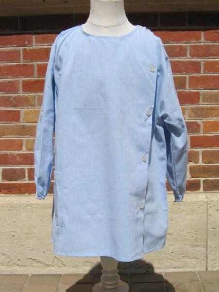 This is one of the styles of boys school smocks offered by Bobine Company in 2005. We know very little about the company at this time. There were several different styles, including front buttoning. This was a side-buttoning style. We are not sure how common they were at French schools. They may have been used for specialty usesuch as art class rather than for the full school day. Here we are not sure. We had thought that smocks were no longer common in French schools. The Bobine smocks here were done in blue and grey shades in sizes 4-16 years. All were done as colarless smocks without waistbands. The characteristics of the smock seen here are: Encolure arrondie,