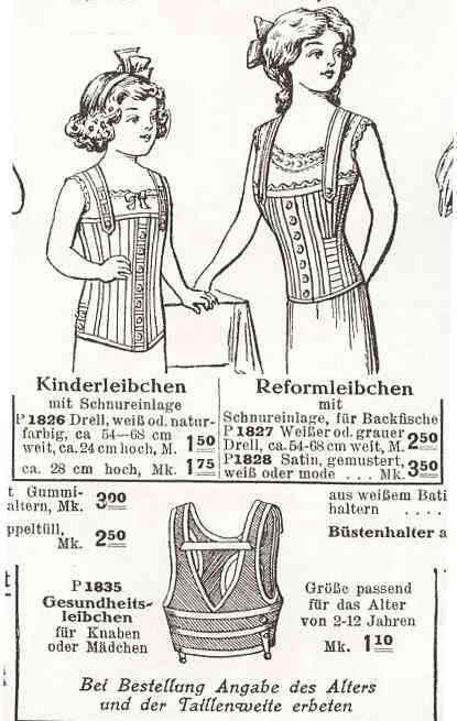 The first image at the top (on the left) is called a "Kinderleibchen" (children's bodice), but it seems to be designed principally for girls because of the form-fitting aspect. It is made of corset-like cotton material, comes in either white or "natural" (apparently a kind of unbleached beige or perhaps grey), has