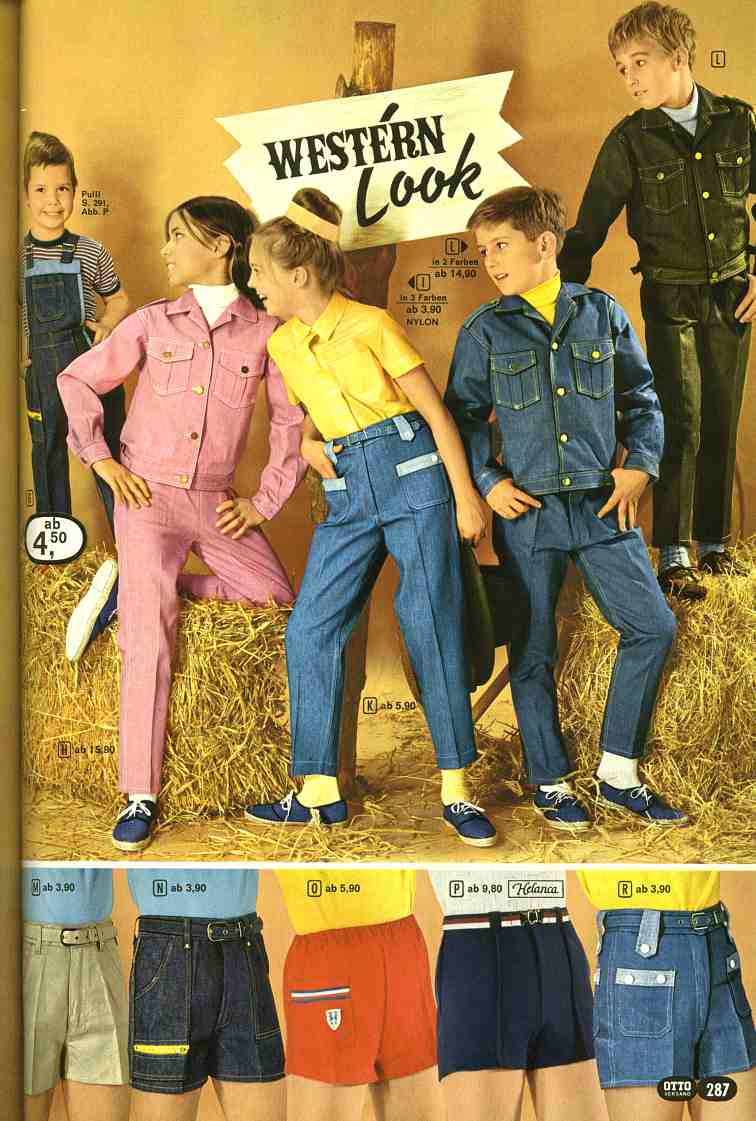 Otto-versandhaus offers denim jackets with matching jeans, billed as the Western look. The jackets are worn with matching long pants jeans. A variety of short pants are also shown, including jean shorts.