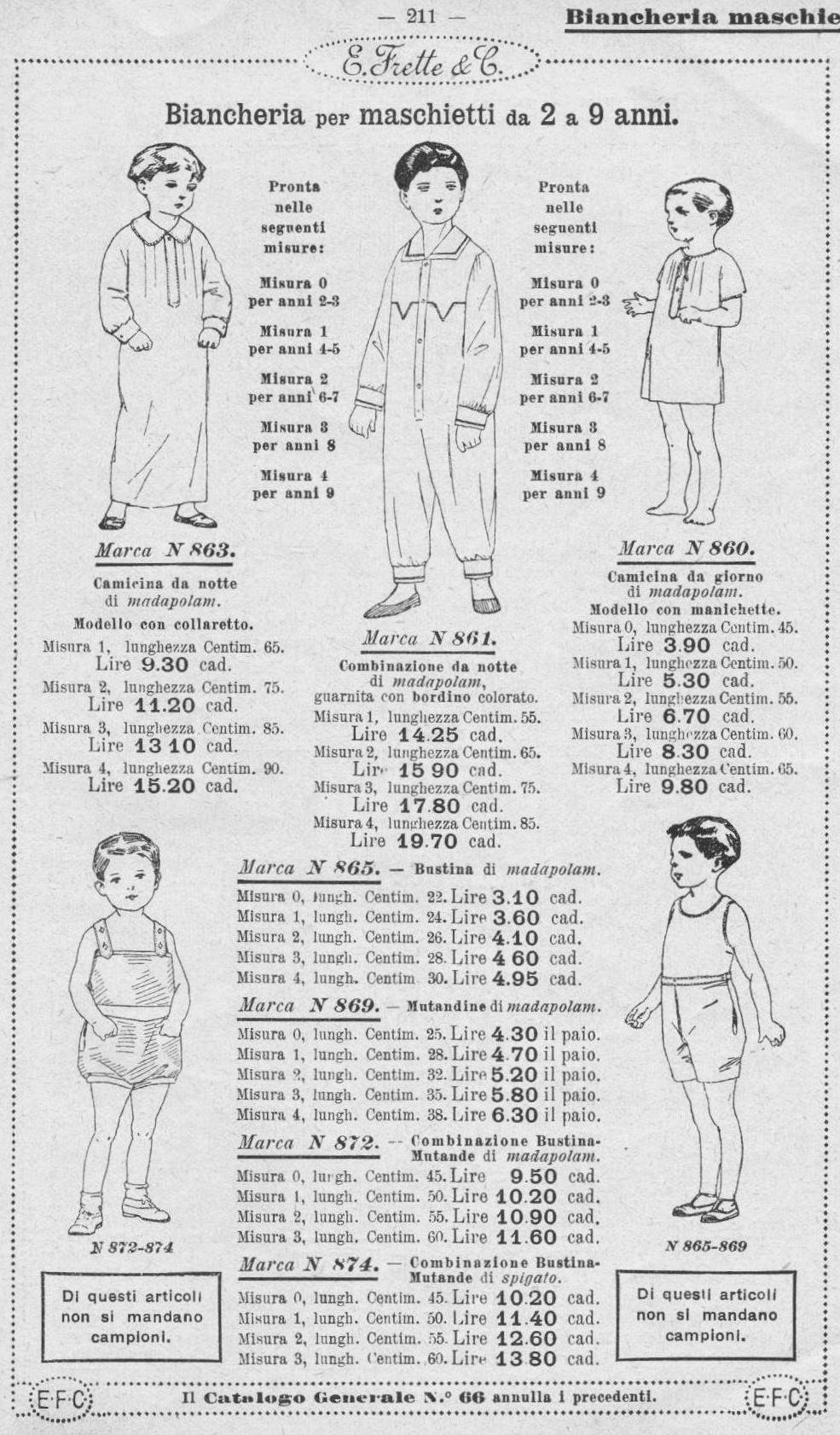 E. Frette explains that the linens for younger boys are offered in various sizes. Pronta nelle seguenti misueri (Ready in the following sixes). There are five different misueri (sizes). So mucg space is devoted to this that there is no room to describe the characteristics and features of the garments. Misura 0 per anni 2-3 (Size 0 for ages 2-3 years); Misura 1 per anni 4-5 (Size 1 for ages 4-5 years); Misura 2 per anni 6-7 years); Misura 3 per anni 8 (Size 3 for age 8 year); and Misura 4 per 9 (Size 4 for age 9 years). And for no reason this information is repeated twice.