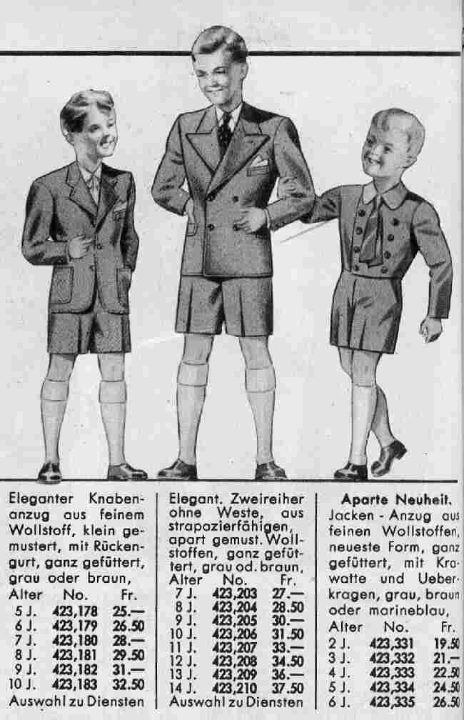 The Jelmoli ad copy read, "Elegant. Zweireiher ohne Weste, aus strapazierfaehigen, apart gemusterten Wollstoffen, ganz gefuettert, graum oder braun. Alter 7 Jahre – 14 Jahre". This translaes as, "Elegant. Dounle-breasted suit without waistcoat, from strainable, distinctively/distingtively??? patterened wool cloth, completely lined, gray or brown. Age 7 years - 14 years."