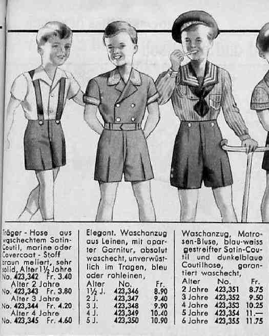 We note several outfits for younger boys in the Jelmoli 1938 catalog. Some seem like play clothes. Other outfits may have been suitable for dressier occassions, although I don't think they would have been a boy's best outfit. The Jelmoli ad copy describes the design and material, but provides no indication of the suitability for various activities. They are for boys 1 1/2 - 6 years of age, this varied from garment to garment. All but the overalls are done in short pants. Stylistically, it is not real clear wht made the various outfits suitable for younger or older boys. Some of the outfits were made for just todler boys while others were made for both todlers and boys just beginning school. This reflects the age group and I think these were mostly for summer wear. The sailor suit outfit had buttons at the leg hem, suggesting that this might be an outfit suitable for dressy occassions. Here we have information on the various outfits offered on this page. Jelmoli had nine different outfits for younger boys. And the ad copy provides some interesting information about the different styles.