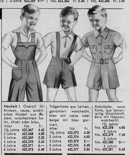 Boys' overalls were new to Europe at that time, probably a fashion imported from the the United States. Hence a "novelty"The ad copy read, "Neuheit! Overall für Knaben, neues, praktisches Modell aus bestem, waschechtem Satin, khaki oder bleu". This meant, Novelty! Boys' overalls, new practical model from best colorfast satin, khaki or blue. Ages 1 1/2 to 6