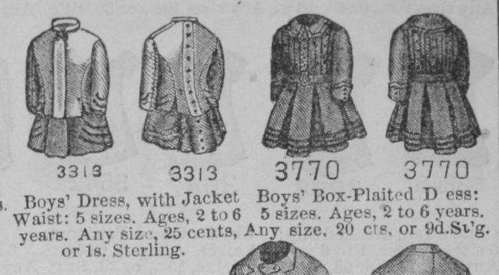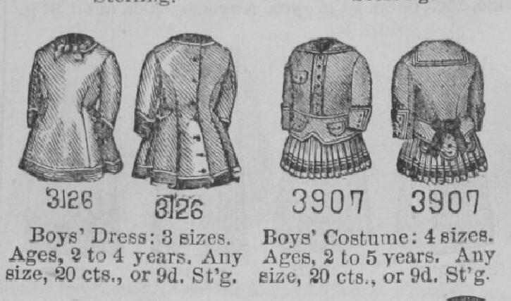 Younger boys still very commonly wore dresses in the 1870s. We note a variety of dress outfits for boys in 1876. Butterrick also offered a variety of skirted outfits labeled "suits". These suits had a jacket separate from the dress. A dress was a one piece outfit. This of course was complicated by the fact that some dresses had javkets or nodices that looked liked jackets. Butterick dresses included patterns labeled both costumes and dresses. I am not sure if there was an actual difference. Butterick may be simply using different terms at random or there may be real differences. If so the specific criterion for the two terms eludes us here. The French word for suit is "costume" this may in part have indluebced the choice of words or perhaps it just sounded better to the boys and parents. We are not sure. All the dresses had a rather plain, suit like look rather than the flouncy styles that girls might wear. The dresses were made to size 4-6 years. This was the age boys commonly began school.