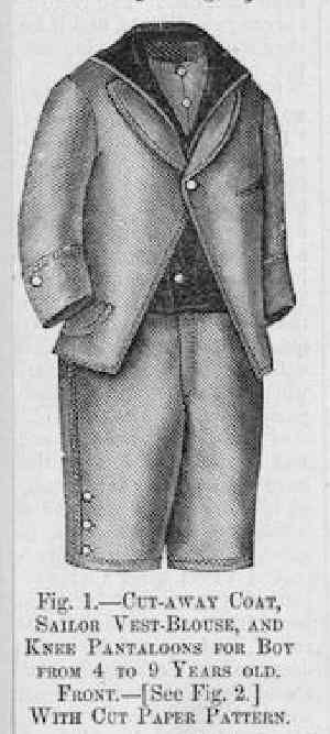 The sailor suit began to become a major fashion style for American boys in the 1870s. We are not sure about the early chronology of sailor suits in America. This is the earliest pattetn we have found todate. It appeared in a 1878 issue of an American fashion magazine, probably Harper's Bazar. The outfit looks rather like a transitional garment. It is a kind of mixture of a cutaway jacket with a sailor suit. We do not nore any of the uniform detailing of a traditional sailor suit. The sailor influence comes from the vest with a dark "V: shaped collar. Note that there appears to a button garment or dickey under the vest. The ad was for a paper pattern to make the suit at home. The outfit was for a boy from 4 to 9 years old, the same age as the tunic suit depicted in the same ad. The outfit consisted of a "Cutaway Coat," a "Sailor Vest-Blouse" and "Knee Pantaloons". The "panatloons" are not knicker-like trousers, however, but kneepants with the traditional three buttons just above the lower hem.