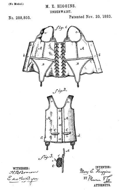 We note a complicated design for a child's underwaist (both boys and girls) submitted for a patent in 1883. The designer was a woman, Mary E. Higgins, who presumably lived in Michigan. The patent number recorded is MI 288,803, and the patent was registered November 20, 1883.