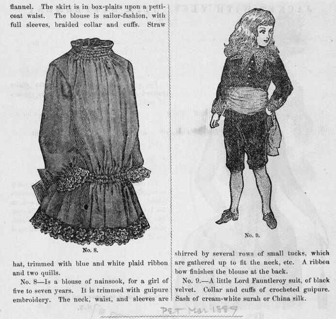 We have found a few items from 1889. Fauntleroy suits had become an important style by the 1880s. We note a Fauntleroy suit from an unidentified publication with some information on materials used. This was a collar buttoning suit with a crocheted collar and an elaborate sash. The suit is worn with long stockings. The illustration comes from the New York Public Library collection. They have sourced the item as PET. We are not yet sure what publication that abreviation represents. It would have been a publication offering patterns. The suit is the collar buttoning suit with a pin-on collar rather thasnb the classic cut-away jacket. The ad copy reads, "A Little Lord Fauntleroy suit of blasck velvet. Collar and cuffs of crocheted guipure. Sash of cream-white surah or China silk." We are not sure what guipure was. Notice the depiction of long uncurled hair. We see thast in illustrations, but the photogaphic record suggests that when long hair was worn, it was usually done in ringets. To us thuis looks more like English Fauntleroy suits than American Fauntleroyb suits. The hair style also look more English than American. Fashions at the time were mostly set in Europe. Thuis the peoople publishing fashiion magazines in Ameruca closeky watched European trends. That may be what is going on here.