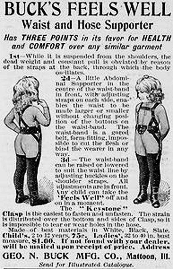 We see quite a few adverisements for Buck's Feels Well waist in the late-1890s. The company patented it in 1895 and immediately advertised in the Ladies Home Journal, the major mass publication magazine reaching American homes. The ad here pointed to three reasons the waist was more healthful and compfortable than other waists on ther market at the time. Feelswell Waists were made by George N. Buck Manufacturing, Matoon, Illinois. We note the ad in the Journal (July 1895, page 21). We do not know much about the company yet, but it may have been the forerunner of the Kern Manufacturing Co since it is also in Mattoon (a very small town). After the turn of the 20th century we do not see many references to the company or the Feelswell Waists.