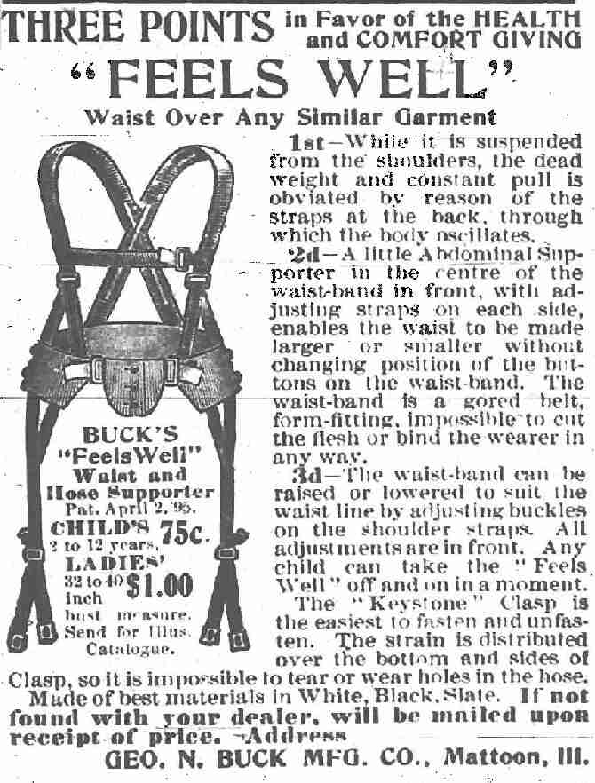 distributed over the bottom and sides of Clasp, so it is impossible to tear or wear holes in the hose. Made of best material in White, Black, Slate. If not found with your dealer, will be mailed upon receipt of price. Address: Geo N. Buck Manufacturing Co., Mattoon, Ill. Buck's "Feels Well" Waist and Hose Supporter, Pat. April 2, 1895. Child's 75 cents, 2 to 12 years. Ladies' 32 to 40 inch bust measure.$1.00. Send for Illustrated Catalogue."