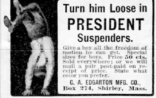 We note an ad for boys' "President" suspenders. "President" was a brand of suspenders made for both men and boys. The manufacturer was the C. A. Edgarton Mfg. Co., Box 274, Shirley, Mass."