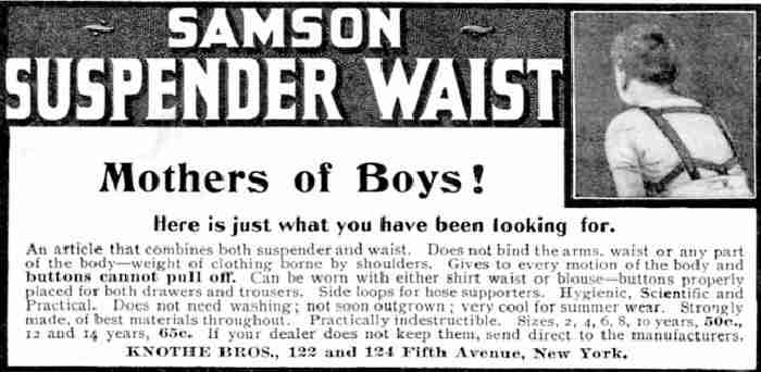 their sons from more primitive waists that "bind the arms, waist or any part of the body." The sizes involved are for boys from 2 to 14 years of age. This waist is somewhat more complex in construction than the Kazoo suspender waist which appears to have sold more widely at a slightly later date. Note that it has attachments for holding up knee trousers, underdrawers, and supporters for long stockings. The ad copy describes the features offered. "Samson Suspender Waist. Mothers of Boys! Here is just what you have been looking for. An article that combines both suspender and waist. Does